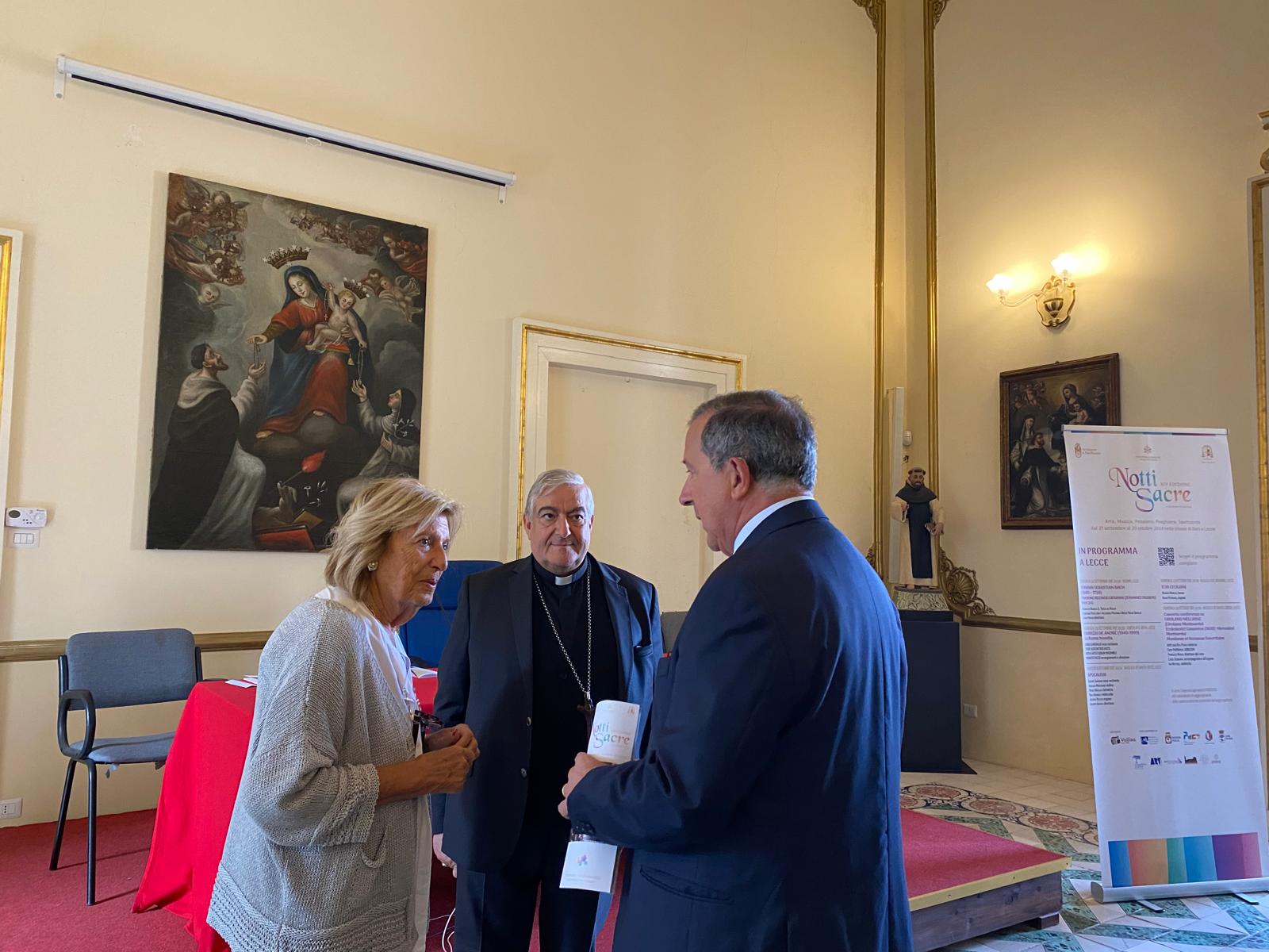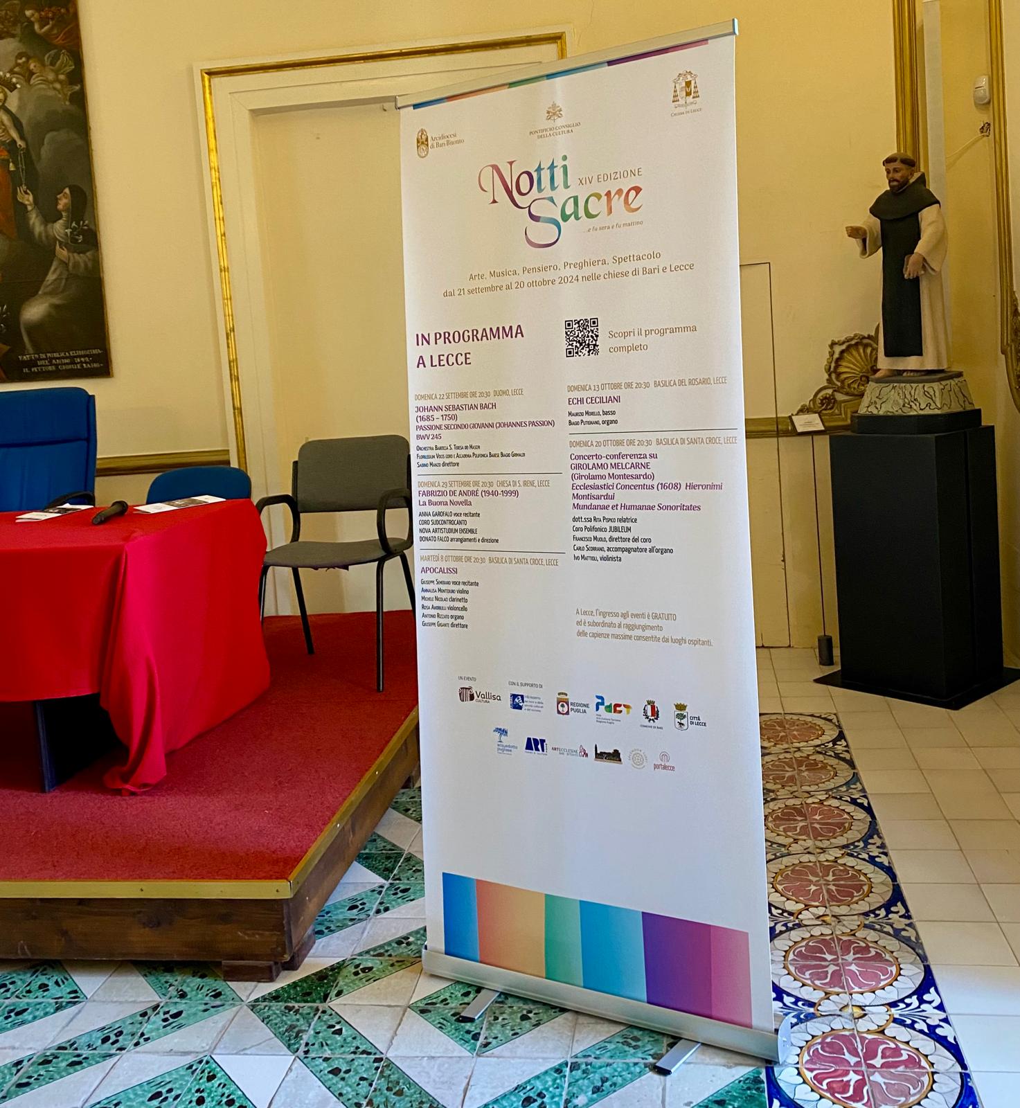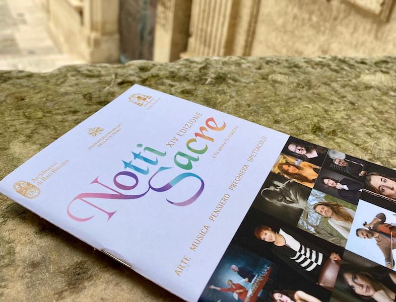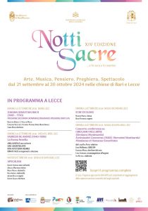“Notti sacre”, in programma dal 21 settembre al 20 ottobre, è un evento di Vallisa Cultura (www.vallisa.it) realizzato in collaborazione con Arcidiocesi di Bari-Bitonto, Arcidiocesi di Lecce e ArtWork (www.artworkcultura.it); si avvale del sostegno del Ministero della Cultura con il Fondo unico per la cultura, del patrocinio del Pontificio Consiglio della Cultura, Regione Puglia, Comune di Bari, Comune di Lecce, Acquedotto Pugliese, e del supporto di ArtEcclesiae Bari-Bitonto, Fondazione Splendor Fidei e Portalecce