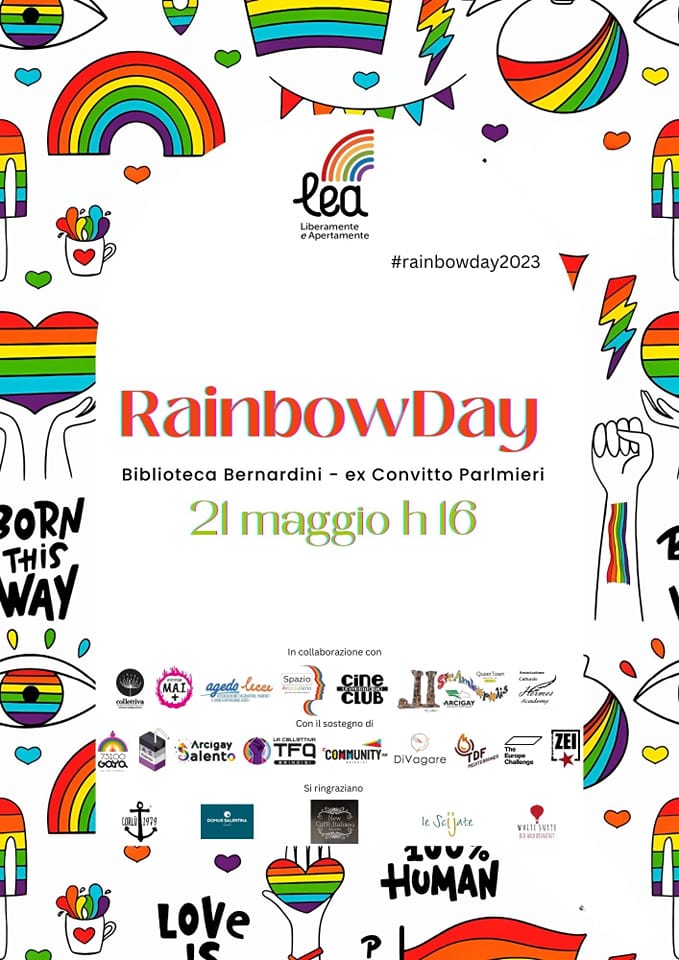 Domenica 21 maggio torna la decima edizione di Rainbow Day. Partirà alle ore 16 la festa in occasione della giornata internazionale contro l’omo-bi-transfobia negli spazi della Biblioteca Bernardini, ex Convitto Palmieri di Lecce. Un appuntamento tra musica e colori, cultura e divertimento. Una vivace rassegna artistica che vedrà, tra i vari, momenti all’insegna della cultura, del divertimento e soprattutto del rispetto della diversità di genere tutta. In programma il reading poetico de “Le poete della Beat” con Collettiva Edizioni e di romanzi a cura di Regine Drag. Numerosi talk, che affronteranno i temi della diversità di genere, dell’omogenitorialità e delle famiglie arcobaleno. Immancabile anche la musica che vedrà protagoniste l’artista Eliana e Pupa DJ. in programma anche la proiezione del documentario C’è un soffio di vita soltanto di Matteo Botrugno e Daniele Coluccini, a cura di Università del Salento.