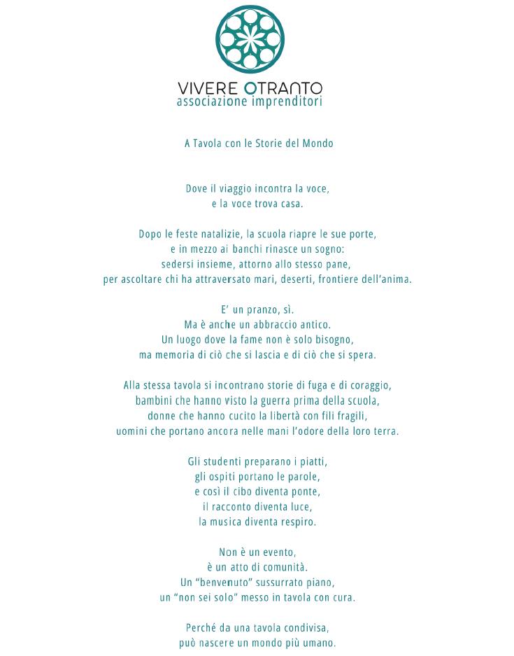La tavola come luogo di incontro, il cibo come linguaggio universale, le storie come ponte tra mondi diversi. Nasce con questo spirito il pranzo solidale “A tavola con le storie del mondo”, promosso dall’Associazione Imprenditori Vivere Otranto in collaborazione con l’Istituto Professionale Alberghiero di Otranto, in programma sabato 24 gennaio 2026, alle ore 10:30, presso la sede centrale dell’istituto.