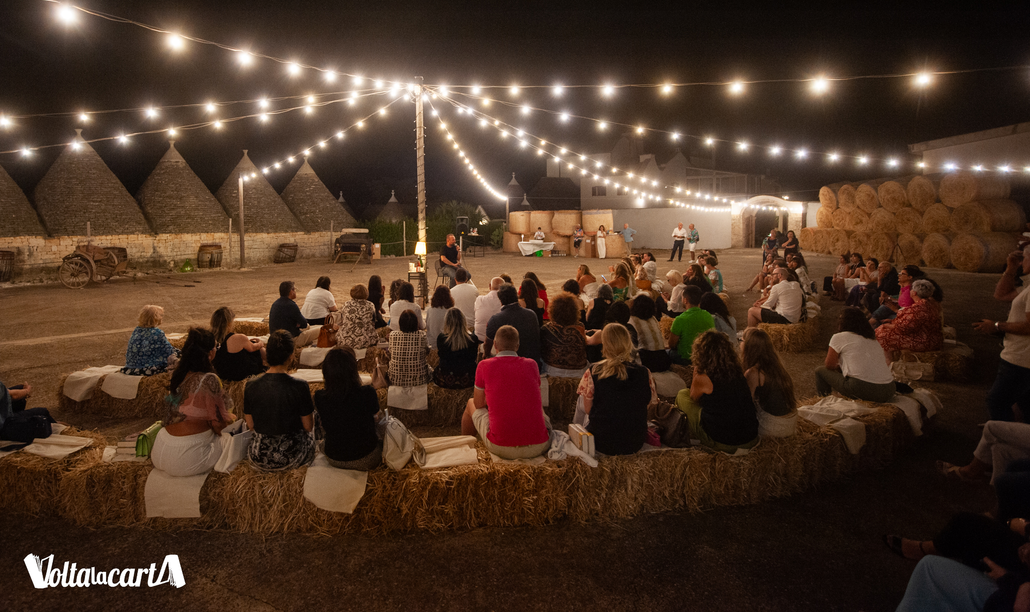 L’idea è nata da un’intuizione. Già dal 2015 organizzavo presentazioni di libri e incontri con autori, perlopiù pugliesi ed esordienti. All’inizio partecipavano poche persone, ma pian piano il pubblico cresceva. A un certo punto, però, mi sono reso conto che non saremmo andati oltre quella cerchia di affezionati. Così mi sono chiesto: cosa possiamo fare per coinvolgere più gente? La risposta è stata: portare i libri e le storie fuori dalla libreria. Da lì è nato Aperitivo d’Autore, un format che unisce letteratura ed enogastronomia e che oggi festeggia i suoi primi dieci anni. Sin dall’inizio l’idea era di renderlo itinerante: abbiamo scelto masserie, terrazze sul mare, palazzi storici e musei. Tra i luoghi più suggestivi ci sono sicuramente le cento masserie di Crispiano, sede anche dell’associazione Volta alla Carta.