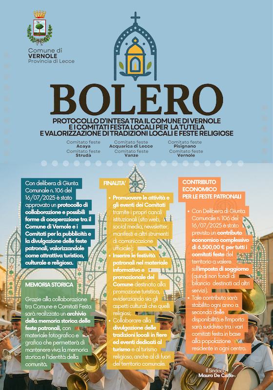 Nasce così BOLERO, protocollo d’intesa tra il Comune di Vernole e i Comitati Feste locali per la tutela e la valorizzazione di tradizioni locali e feste religiose, approvato con delibera di Giunta comunale n. 106 del 16/07/2025.
