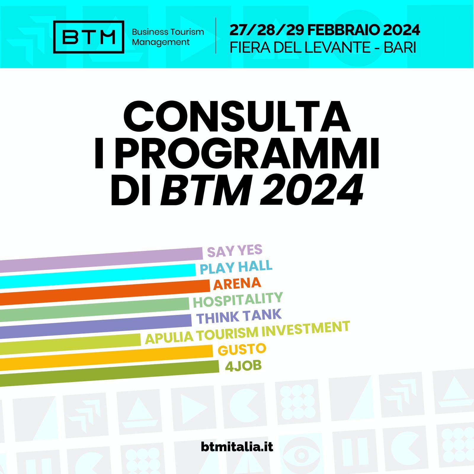 Le sale conferenze in BTM 2024 saranno: PLAY HALL, THINK TANK, HOSPITALITY, ARENA DEL GUSTO, AREA BTM 4JOB, AREA A.T.I. (Apulia Torism Investemt); SAY YES, ARENA.