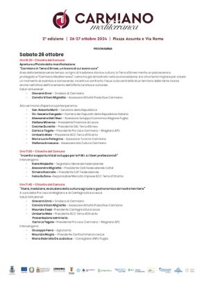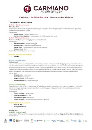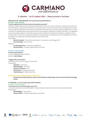 “Carmiano Mediterranea – ha sottolineato il sindaco Erroi – rappresenta un importante veicolo di cultura locale, come testimonia il programma articolato attraverso attività che abbracciano l’universo enogastronomico, quello artigianale, quello storico, artistico e culturale, a dimostrazione della vivacità del territorio e del forte legame con la sua comunità”.