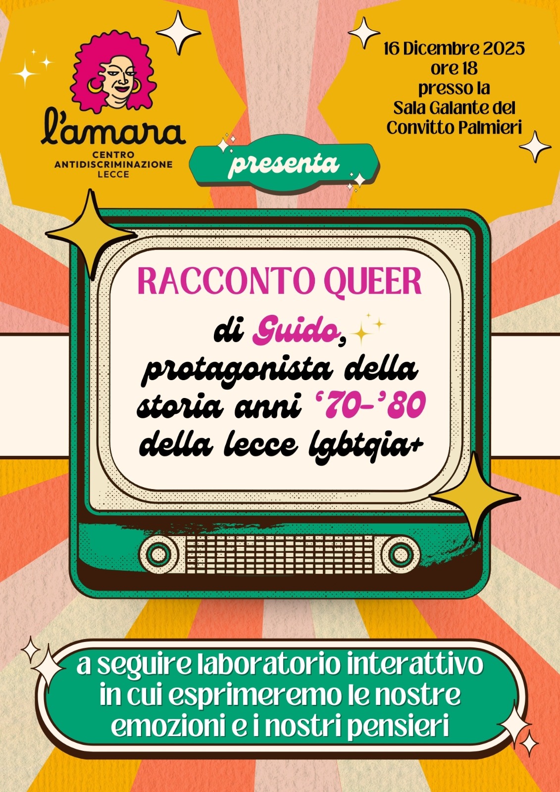 L’iniziativa si aprirà alle 18:00 con l’incontro con Guido, testimone diretto di memorie collettive che accompagnerà il pubblico in un viaggio nella comunità LGBTQIA+ nella Lecce degli anni Ottanta. Un racconto che intreccia vissuti personali e storia sociale, offrendo uno sguardo prezioso su un periodo complesso, fatto di resistenze silenziose, identità in costruzione e legami comunitari spesso nati ai margini.