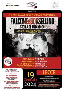 Venerdì 19 gennaio 2024, alle 19.00, al Museo Castromediano di Lecce, la Compagnia Tèmenos – recinti teatrali, in collaborazione con il Polo Biblio-museale di Lecce, presenta “Falcone e Borsellino. Storia di un dialogo” di Maria Francesca Mariano. In scena Marco A. Romano nel ruolo di Paolo Borsellino; Mino Profico, in quello di Giovanni Falcone, Liliana Putino nel ruolo di Agnese e Maria Falcone e Valentina Piccolo in quello di Francesca Morvillo.