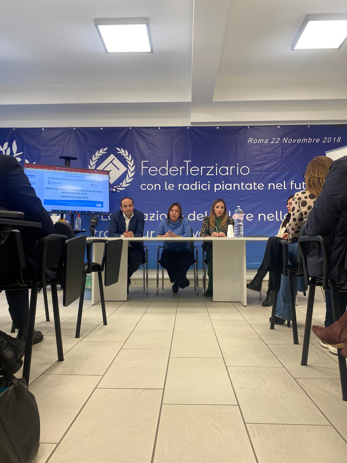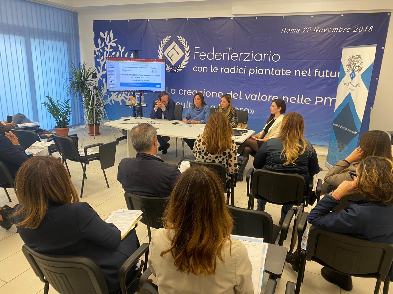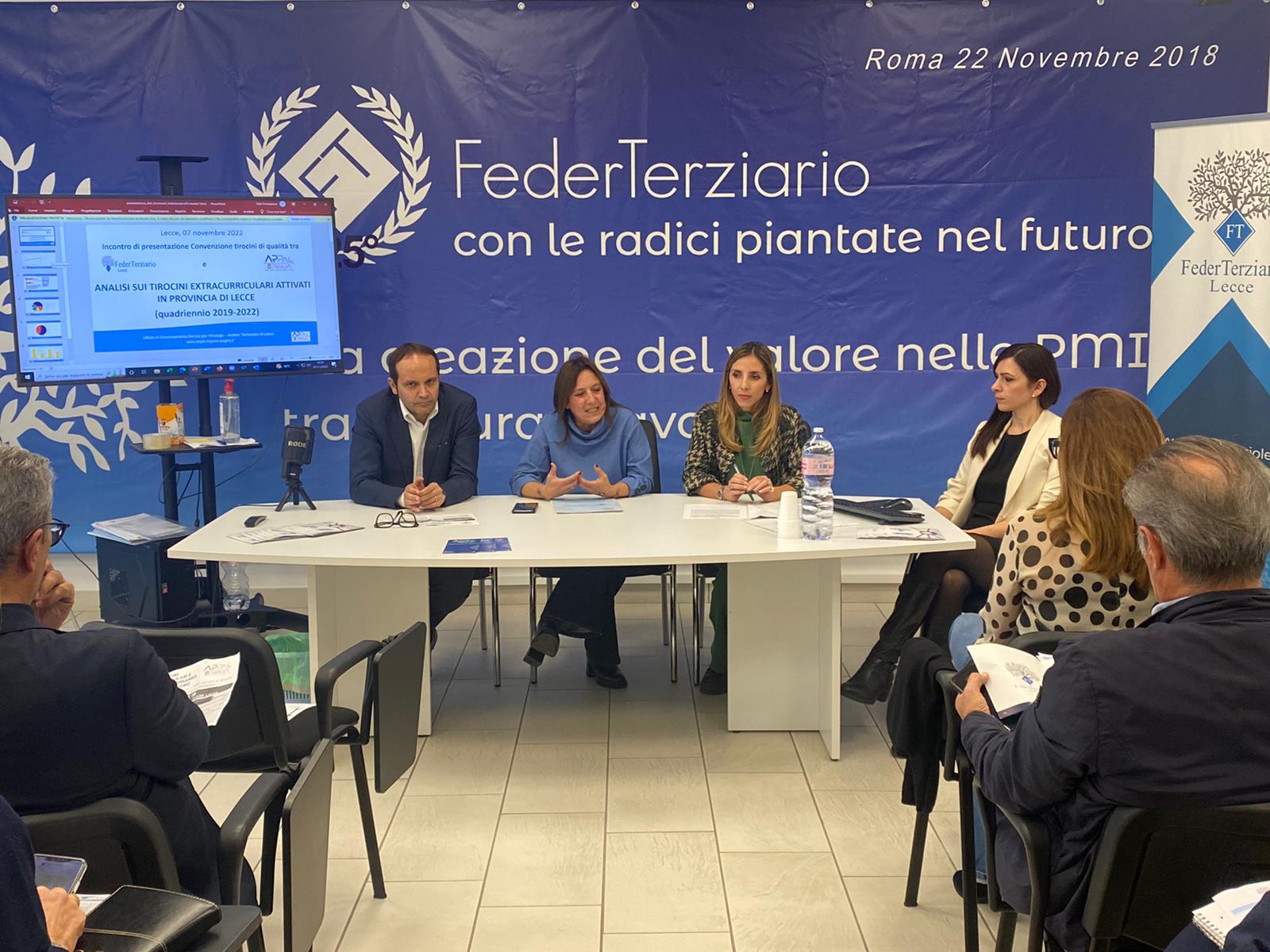 Si è tenuto nelle scorse ora, nelle sale di FederTerziario Lecce, l’incontro di presentazione della convenzione Tirocini Extracurriculari tra FederTerziario e il centro per l’impiego Arpal Puglia. Alla presenza di professionisti e aziende del settore è stata resa pubblica la convenzione quadro per la promozione e la realizzazione di tirocini di qualità e delle altre politiche attive di inserimento lavorativo sottoscritta il 3 ottobre scorso. Focus sull’importante impulso che i tirocini extracurriculari hanno nel mondo del lavoro e nell’incrocio tra domanda e offerta da parte delle aziende aderenti alla Confederazione. Un nuovo servizio garantito dall’unione di FederTerziario Lecce e Arpal Puglia omogeneo e uniforme per tutte le imprese del territorio aderenti.
