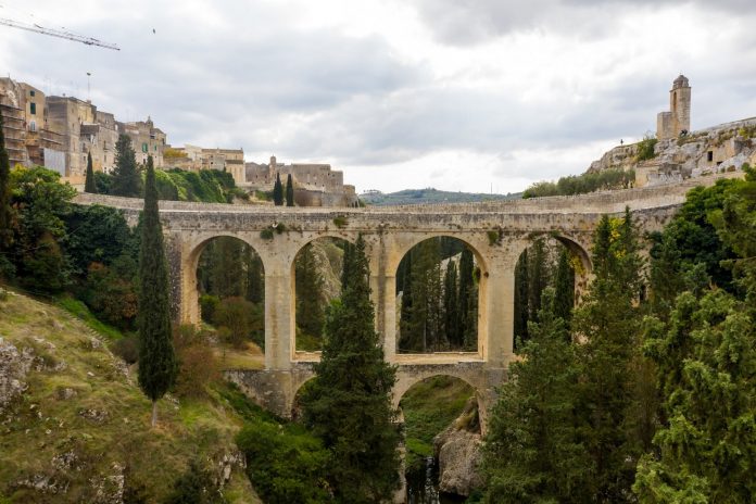 Il Ponte Acquedotto è un’imponente struttura ad archi, alta 37 metri, lunga 90 e larga 5,5, che collega le sponde del torrente Gravina. Fu costruito per permettere l’attraversamento del Crapo (l’antico nome del torrente Gravina) e consentire ai fedeli di raggiungere la Chiesetta della Madonna della Stella. Attestato almeno dal 1686, quando fu probabilmente reso instabile da un sisma, crollò col terremoto del 1722. Fu la famiglia Orsini di Roma, che si era trasferita nel feudo di Gravina, a ordinare, intorno a metà Settecento, la ricostruzione e la trasformazione del ponte in acquedotto, per portare oltre le mura della città le acque di due sorgenti. La struttura portante che lo collegava alle due fontane, ancora oggi esistenti ai due lati opposti, era costituita da 25 archi a doppio ordine. Resi pericolanti da un’alluvione nel 1855, furono sostituiti da una spalliera in tufo. Il ponte, protagonista di una scena del film di James Bond No time to die, è percorribile ed è stato da poco oggetto di un importante restauro. Nel 2020, in occasione della X edizione del Censimento “I Luoghi del Cuore” promosso dal FAI è stato il luogo più votato in Puglia con 25.726 segnalazioni. Proprio in occasione delle Giornate FAI d’Autunno 2024 verrà inaugurato il progetto di valorizzazione del bene, incentrato sull’illuminazione scenica e di sicurezza per il percorso pedonale e degli archi, sostenuto con il contributo assegnato nell’ambito de “I Luoghi del Cuore”. Sabato 12 dalle ore 18 è prevista la presentazione del progetto, seguita da una vera e propria festa del luogo del cuore che si concluderà in serata con l’accensione delle nuove luci del ponte e uno spettacolo pirotecnico e musicale. Domenica 13 ottobre saranno invece proposte delle visite che partiranno dalla chiesetta di Santa Maria degli Angeli, per poi proseguire fino al Ponte, di cui verranno raccontati storia, caratteristiche, curiosità e l’habitat rupestre circostante.