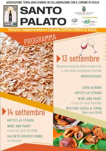 La manifestazione, che si terrà congiuntamente in Piazza Umberto I, Piazza XXIV Maggio, Via San Giovanni e Largo Porta Nuova, includerà, oltre alle degustazioni enogastronomiche, una lunga serie di intrattenimenti artistici e culturali come musica dal vivo, improvvisazioni teatrali e laboratori artistici, ripercorrendo le orme della migliore tradizione vegliese e salentina.