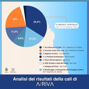 – il 34,4% delle risposte ha interessato il progetto relativo al Via libera per la Costa da Torre Specchia e Sant’Andrea (progetto 1) con particolare accento alla mobilità dolce, all’incremento dell’illuminazione pubblica, alla tutela della falesia e dell’habitat naturale e alcuni input su come implementare i servizi per il turista come percorsi enogastronomici e noleggio bike;