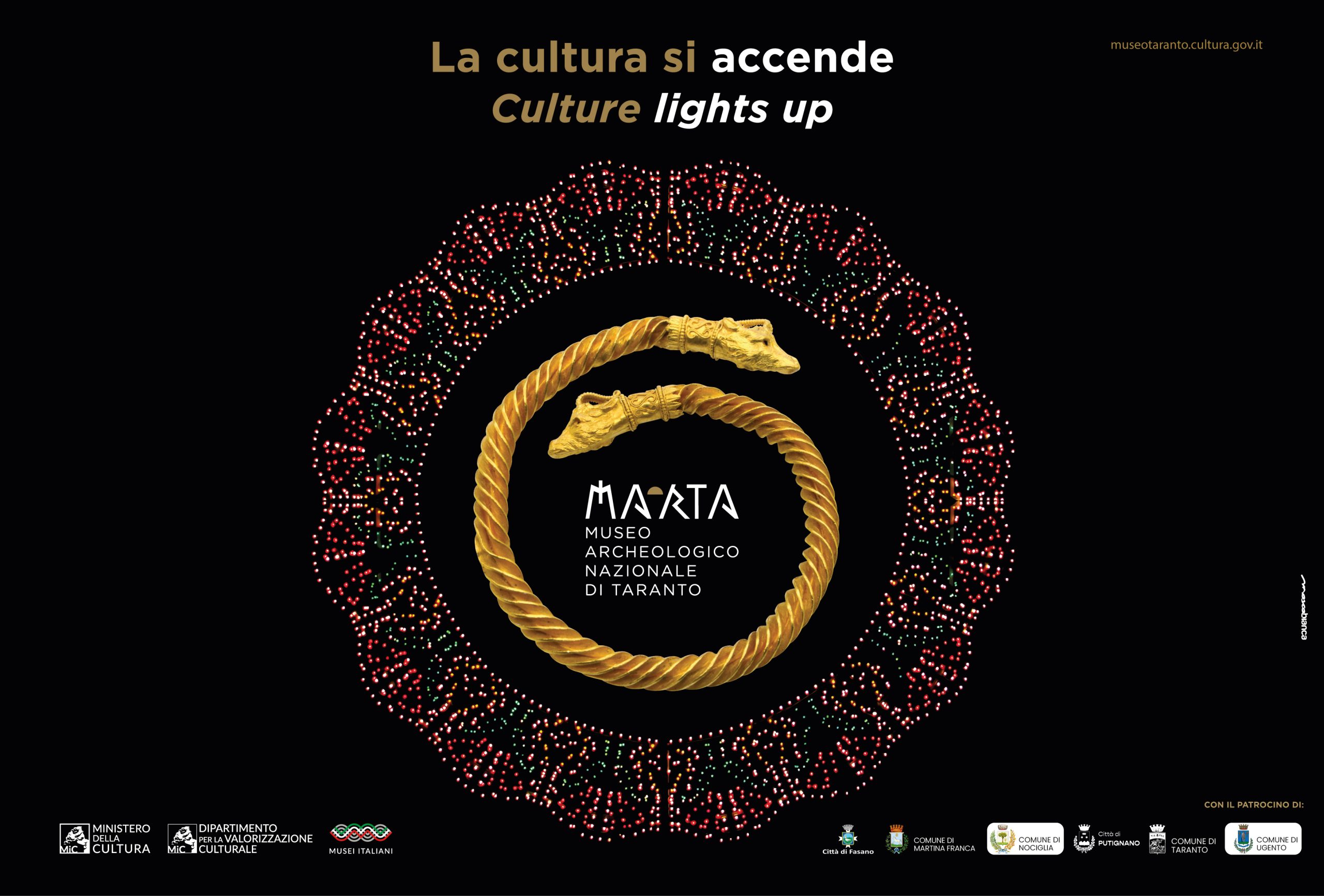 Ma guai a generalizzare. Le collaborazioni con i comuni pugliesi sono tutte site specific e sono destinate alla costruzione di un modello di progettazione culturale condivisa. Una sfida globale che parte dal locale. Localissimo. Non a caso l’identità visiva, che racchiude tutta la campagna di affissioni di promozione del museo, poggia le sue basi su due elementi specifici: un monile in oro (un bracciale a verga tortile) proveniente da un corredo funebre rinvenuto a Mottola (in provincia di Taranto), reperto di pregio della famosa collezione degli Ori di manifattura magno greca (IV – II sec. a.C.), e una tipica luminaria pugliese, elevata a simbolo della cultura popolare, che è radicata sul territorio e che con il tempo è diventata identità e tratto distintivo di tutta la Puglia.