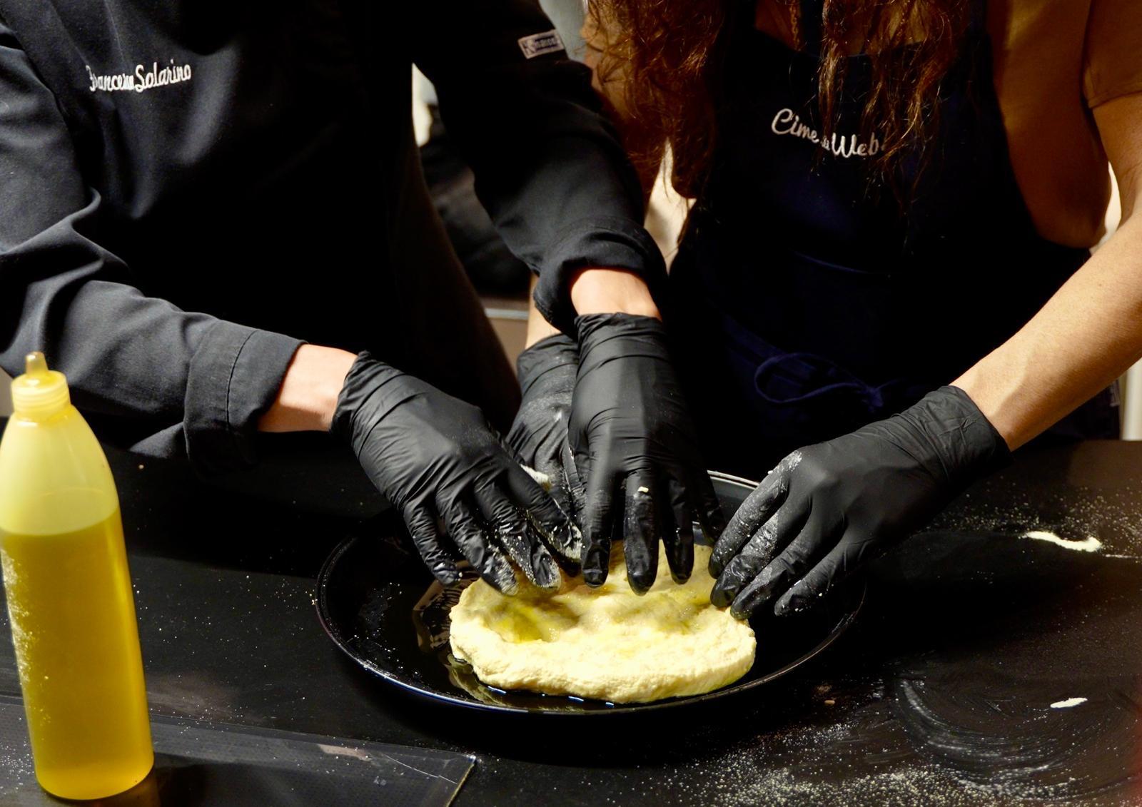 Non è mancato l’aspetto pratico: con Francesca e Valeria della scuola di cucina barese “Cime di Web”, i partecipanti imparano a usare gli ingredienti scoperti, preparando un classico della tradizione: la focaccia barese.
