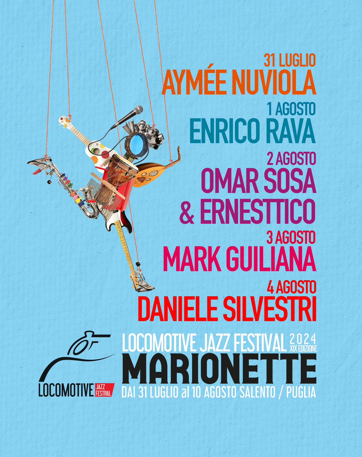 Dal 31 luglio al 10 agosto la musica d’autore segnerà il battito dell’estate salentina al ritmo del Locomotive Jazz Festival che, per la sua XIX edizione, ha scelto un tema che è un invito alla riflessione e alla speranza: Marionette.