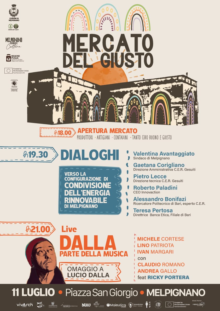Il primo appuntamento è previsto per venerdì 11 luglio, a partire dalle 18 in Piazza San Giorgio. Per quell’ora apriranno infatti i mercatini e gli stand gastronomici, che resteranno a disposizione del pubblico fino al termine della serata. Dalle 19.30 prenderà via il dibattito dal titolo “Verso la configurazione di condivisione dell’energia rinnovabile di Melpignano”, un incontro sul tema dell’ambiente, a cuore sin dall’inizio all’amministrazione comunale. Oltre alla sindaca Valentina Avantaggiato, sul palco ci saranno a dialogare anche Gaetana Corigliano, della direzione amministrativa Comunità energetica rinnovabile dei Gesuiti; Pietro Lecce, della direzione tecnica della Cer Gesuiti; Roberto Paladini, a capo di Innovaction, Alessandro Bonifazi, ricercatore del Politecnico di Bari ed esperto di comunità energetiche rinnovabili e Teresa Pertosa, direttrice della filiale barese di Banca Etica. Un incontro sulla questione delle comunità energetiche, tra i primi, rivoluzionari progetti lanciati dalla attuale giunta, per diventare produttori di energia pulita e rinnovabile favorendo percorsi di inclusione, riduzione della povertà energetica e promozione sociale ed economica delle categorie più vulnerabili. Al termine del dibattito, il live previsto per le 21. “Dalla parte della musica” è infatti il titolo dello spettacolo musicale, omaggio a Lucio Dalla, che vedrà il cantautore salentino Michele Cortese interpretare i brani dell’artista bolognese scomparso. Vincitore del Festival di Viña del Mar e con una solida esperienza internazionale, Cortese firma questo omaggio come atto d’amore verso uno dei più grandi artisti del Paese. Sarà affiancato da altri, prestigiosi nomi del panorama musicale: Ricky Portera, storico chitarrista di Lucio Dalla e co-fondatore degli Stadio, è la memoria vivente di un sodalizio artistico che ha segnato la storia della musica italiana. La sua chitarra graffiante, lirica ed energica rivive le atmosfere dei grandi successi di Dalla.