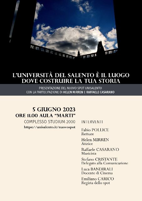 «La realizzazione dello spot è stata un’operazione collettiva e multidisciplinare – ha spiegato Stefano Cristante, docente di Sociologia, Delegato alla Comunicazione -. Abbiamo unito competenze sulla scrittura e sulla logistica, sulla ricerca d’archivio e sulle tecnologie di ripresa, potendo contare sul supporto di tecnici e professionisti di alto livello. La presenza di Helen Mirren e di Raffaele Casarano, che hanno onorato con generosità il loro ruolo di Ambasciatori di UniSalento, ci ha consentito di immaginare un’esperienza universitaria piena di passione e di bellezza».