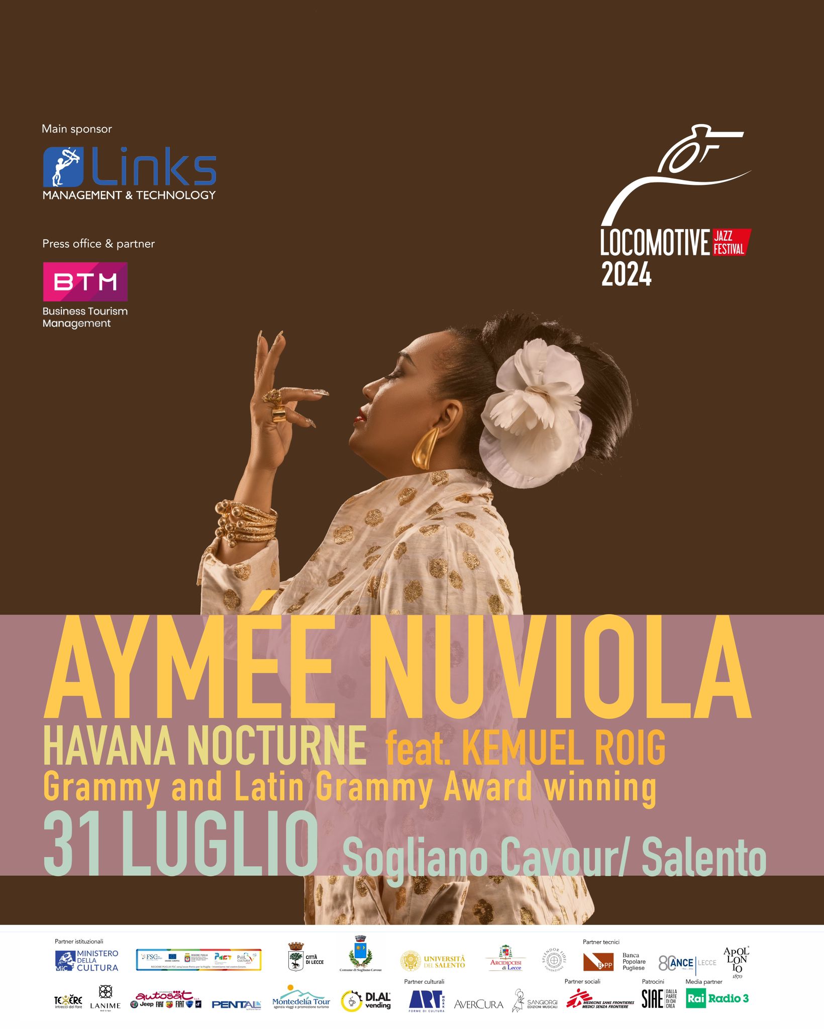 31 luglio: alle ore 19.00 Alceste Ayroldi, critico musicale e saggista, presenta il suo libro: “Fatti e misfatti dell’industria musicale italiana (Arcana Editrice). A seguire, alle 21.00 apertura ufficiale del Festival con lo spettacolo teatrale “Paladini di Francia”, a cura di KOREJA Teatro e alle 22.00 musica e bellezza con AYMÉE NUVIOLA quintet feat. KEMUEL ROIG e con JULIAN AVILA, JOSE “MAJITO” AGUILERA, YANDY GARCIA- PALACIO, SAMUEL BURGOS in HAVANA NOCTURNE. E poi l’after show, ‘Latin party’ con DJ GEPPO.