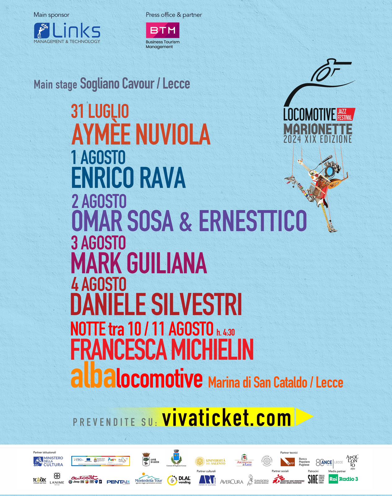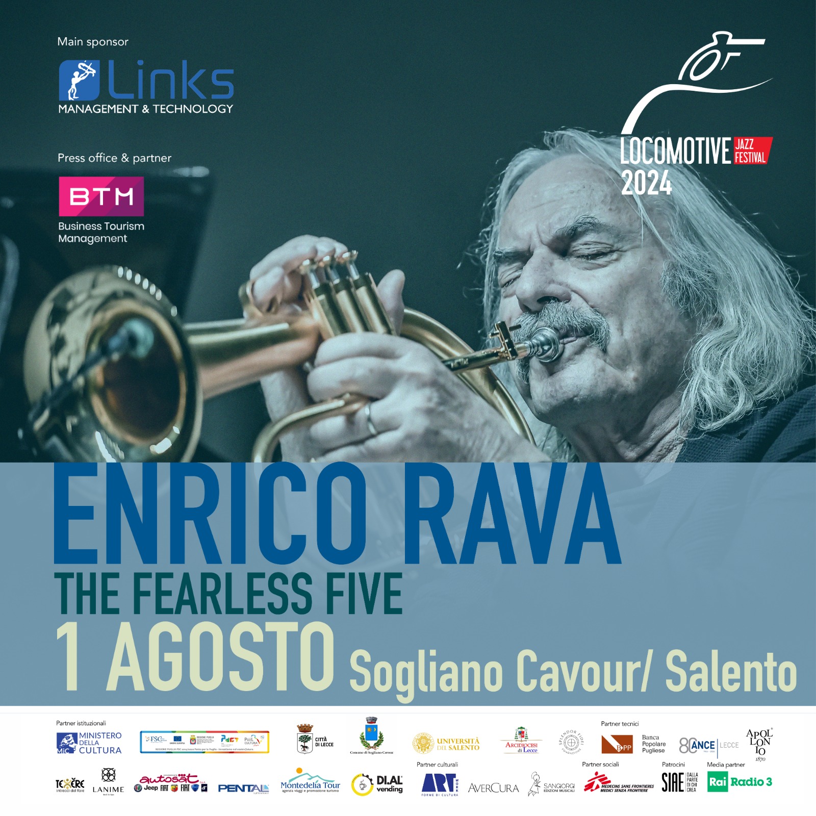 1 agosto:, ore 19.30 riflessione sul tema ‘MARIONETTE’ (che è il tema di questa XIX del LJF) con Stefano Cristante, docente di Sociologia della Comunicazione all’Università del Salento. A seguire, alle ore 22.00, ENRICO RAVA ‘THE FEARLESS FIVE’