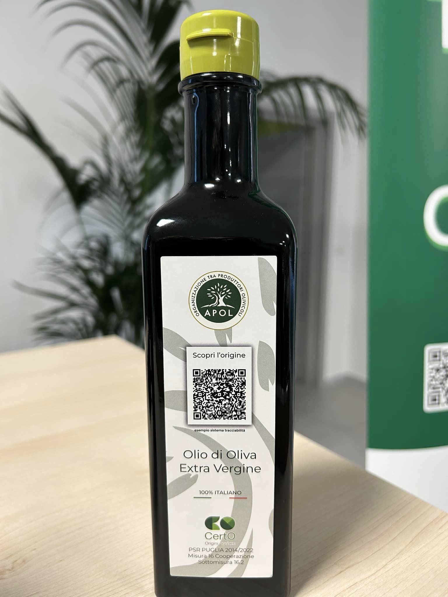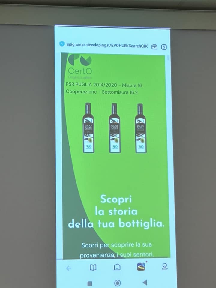 Dal Giappone o dall’Australia, in qualsiasi parte del mondo si trovi, grazie a “Certo”, il consumatore semplicemente tenendo tra le mani una bottiglia di olio EVO pugliese potrà compiere con un viaggio di migliaia di chilometri, senza muoversi dal punto in cui si trova, e arrivare direttamente nel frantoio in cui è stata prodotta quella bottiglia e poi nell’uliveto in cui sono state raccolte le olive che hanno dato vita all’olio extravergine imbottigliato.