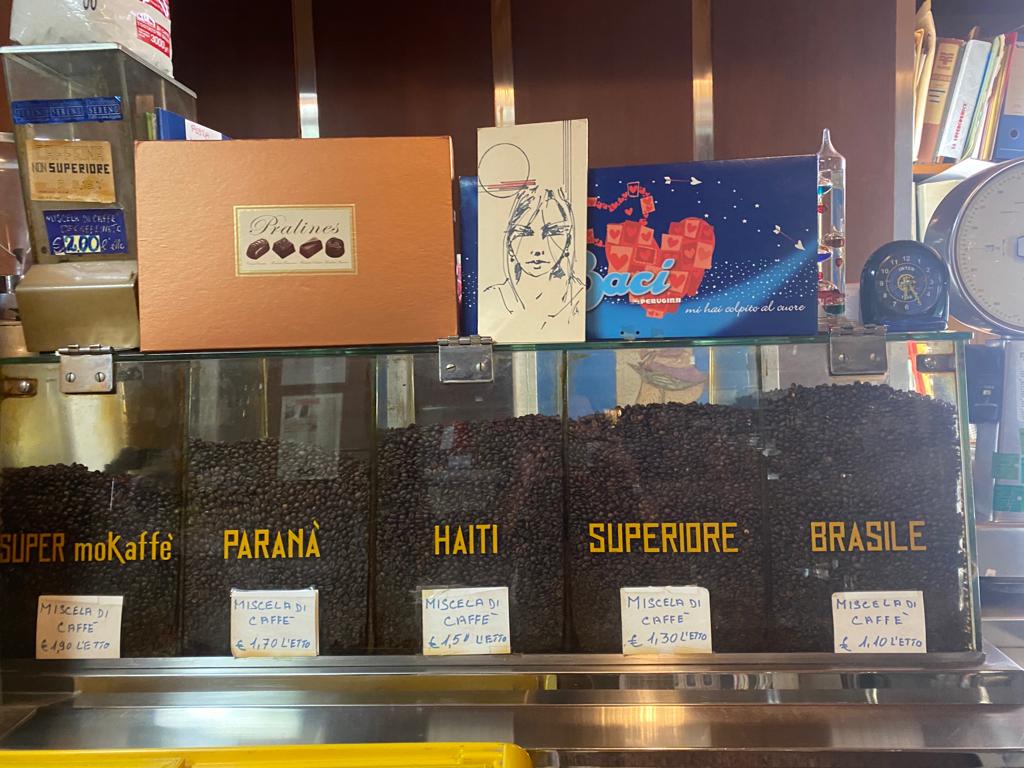 Alle spalle dei divanetti, le vetrinette conservano liquori, scatole di cioccolatini e caramelle.