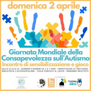 Domenica 2 aprile, in occasione della XVI edizione della Giornata Internazionale della Consapevolezza sull’Autismo, presso la biblioteca “L’Acchiappalibri” di Lecce si terrà un incontro con genitori e bambini da 3 a 7 anni, promosso dallo studio Psico-Educativo “Felicemente” in collaborazione con l’associazione Fermenti Lattici nell’ambito del progetto “Ip Ip Urrà” e finanziato dall’ Impresa Sociale Con i Bambini attraverso il Fondo per il Contrasto della Povertà Educativa Minorile.