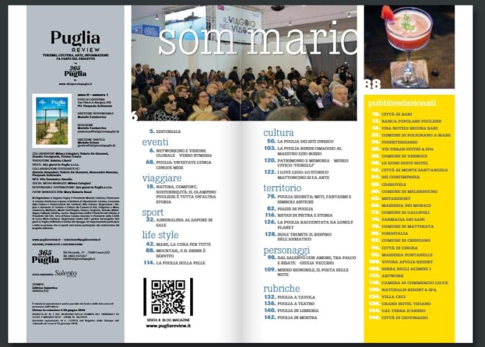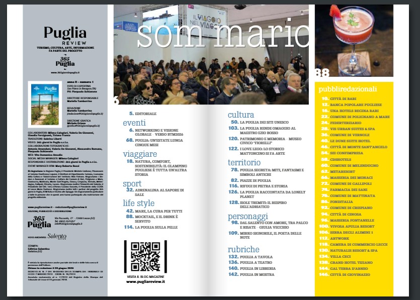 Il nuovo numero estivo di Puglia Review, anima editoriale del progetto 365 Giorni in Puglia, può essere sfogliato anche in formato digitale, gratuitamente e ovunque ci si trovi. Un’edizione speciale che racconta, come sempre, la Puglia più autentica e sorprendente, in un viaggio che abbraccia tutta la regione: dal promontorio del Gargano fino al Capo di Leuca, attraversando borghi sospesi nel tempo, città vibranti, e ovviamente il protagonista indiscusso dell’estate pugliese: il mare. Tradizioni, paesaggi, eventi, storie, gusto, cultura, architettura e nuove tendenze si intrecciano in pagine curate nei minimi dettagli, dalla scrittura alla grafica, dalle immagini alle traduzioni in inglese (per accorciare le distanze con i lettori stranieri). Tutto pensato per offrire un’esperienza di lettura coinvolgente, leggera ma profonda, adatta sia al lettore curioso che al professionista del turismo.