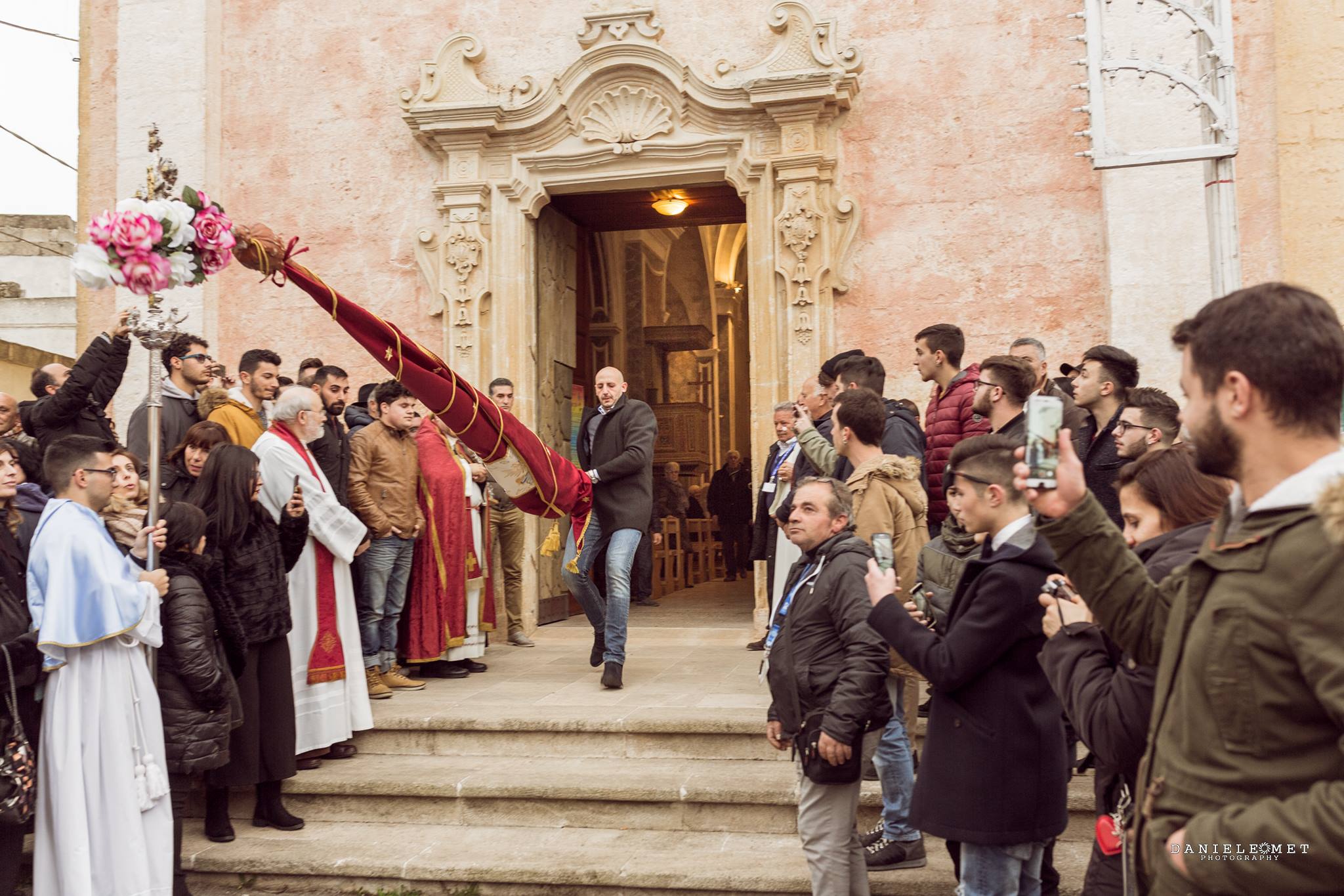 Tra pochi giorni quindi i tiggianesi torneranno a inneggiare il loro “Santu Pati”, cominciando la mattina con la tradizionale fiera del bestiame e dei prodotti agricoli e proseguendo nel pomeriggio con la solenne processione. Questa è aperta dalla “prova dell’erezione”: l’uomo che si è aggiudicato l’asta, versando la maggiore somma di denaro in favore del Santo, ha il compito di portare “lu stannarddhru”, il grande stendardo composto da un drappo rosso che avvolge un’asta lunga 7 metri, sormontata da una pigna di ghisa di cinque chili. Questo dev’essere issato, poi imbracciato e, in parallelo alla strada, trasportato dal sagrato della chiesa di Sant’ippazio alla chiesa della Madonna Assunta dove dovrà essere innalzato con strappo deciso. Un tragitto di circa cento metri da percorrere non a passo lento, come in un normale corteo ma, al contrario, di corsa! Questa impegnativa prova di virilità, consuetudine che secondo alcuni sarebbe una rivisitazione pagana dei riti di fertilità sostenuti durante il capodanno contadino, testimonia il ruolo di Sant’Ippazio, riconosciuto dai fedeli non solo come propiziatore del buon raccolto, ma anche come protettore della fertilità maschile e dell’ernia inguinale, capace di concedere la grazia e guarire da problemi di fertilità o di impotenza. Per questo motivo ancora oggi molte madri del posto sono solite portare al suo altare i nascituri maschi, chiedendo per loro protezione e una sana vita sessuale, mentre alcune mogli chiedono l’intercessione strofinando un fazzoletto sulla statua lignea per poi passarlo di notte tra le gambe del marito con disfunzioni sessuali. Le stesse “pestanache”, varietà di carote dolci giallo-viola coltivate nel territorio circostante, alle quali viene dedicata una vera e propria sagra, secondo la tradizione devono essere acquistate insieme a due grosse “scìscele” (giuggiole), componendo una sorta di quadro allegorico che allude ai genitali maschili e allo stesso tempo valorizza i prodotti locali.
