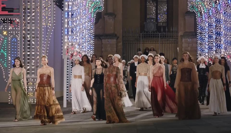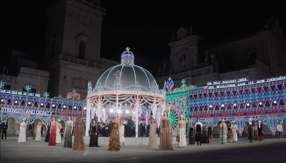 Tutto è stato perfetto. Abbiamo assistito ad un gioco di armonie in cui suoni, movimenti, voci, luci e parole si sono intrecciati in un ricamo sublime, come sublimi sono gli abiti della collezione Dior Cruise 2021, gioielli di rara bellezza enfatizzati da un contesto che, al pari di un mosaico, si è completato, tassello dopo tassello, davanti ai nostri occhi.