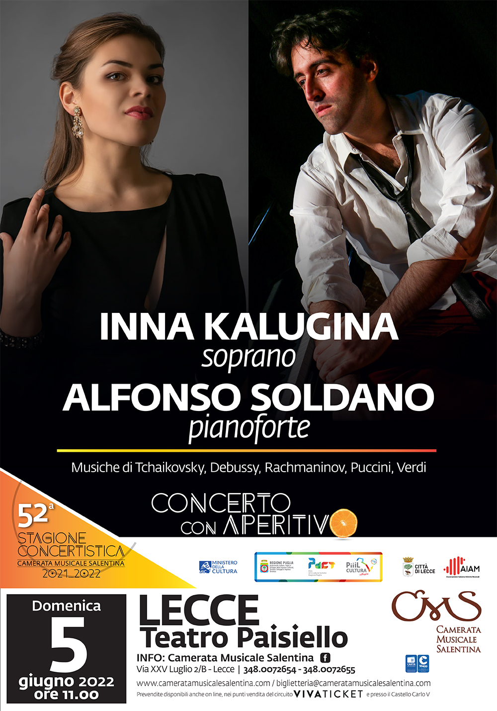 Inna Kalugina, giovane soprano di origini ucraine, si esibirà sulle note del pianista Alfonso Soldano che eseguirà musiche di Rachmaninov, Tchaikovsky, Strauss, Debussy e Verdi.